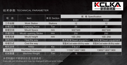 Technical parameter. ItermSectionEK81EK82Work StationStation1212Clamping Forcekgf2535Mould Spacemm500*500650*500Mould-opening Sroketmm250250Mould Heightmm100-250100-250Heating method Steam equipmentSteam equipmentCooling method Cool water + Icy waterCool water + Icy waterMotorKw7.5+2.27.5+2.2Machine......