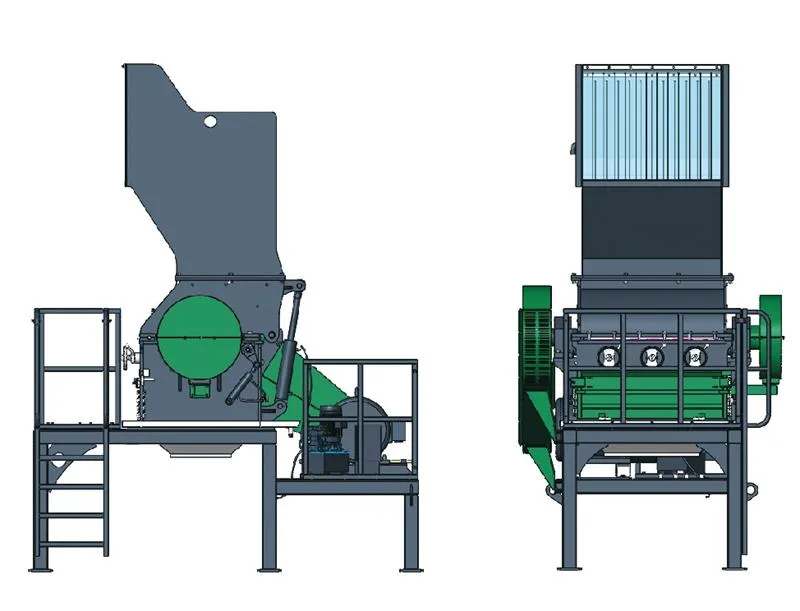The DGF Series -specify for Fiml and Bottle Granulator has a centrally hinged two-piece cutting chamber with a robust welded steel construction, with the upper and lower sections of the housing meeting horizontally. Reversible stator knives with double cutting edges are fitted as single elements to the lower section of the housing, allowing multiple re-sharpening and adjustment of the stator knives. There is a hinged screen cradle and hinged door for easy screen access.